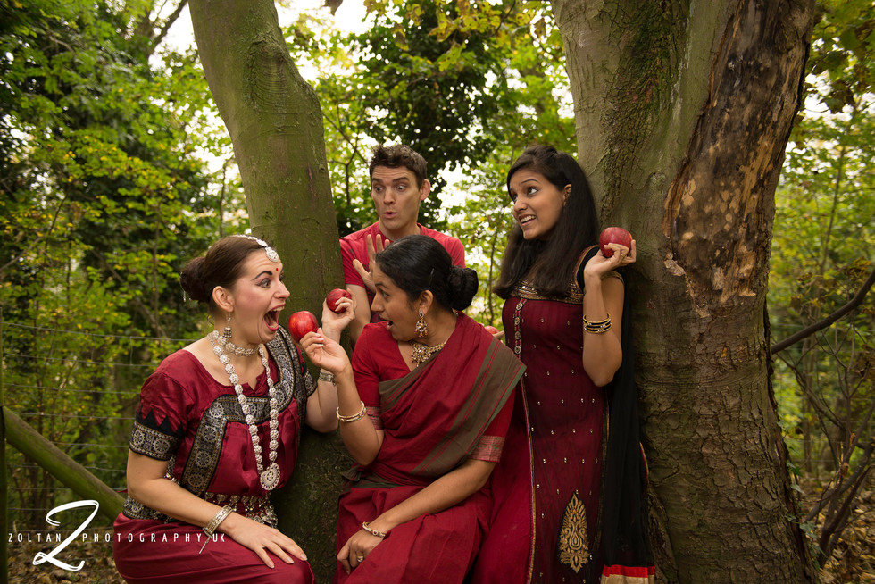 These photos were made to promote a new and unique show presented by the Sanskruti Dance Troop in Cambridge lead by Krishna Zivraj-Nair. This show brings the whole world together in terms of stories, and different styles of dance. The children's story Snow White, was told by different Indian and contemporary dances like the Bharatanatyam, Odissi. We teamed up with the stars of the act, including a beautiful Snow White, and a handsome huntsman near a forest outside Cambridge, and of course, we brought the main essential ingredient, the apples!